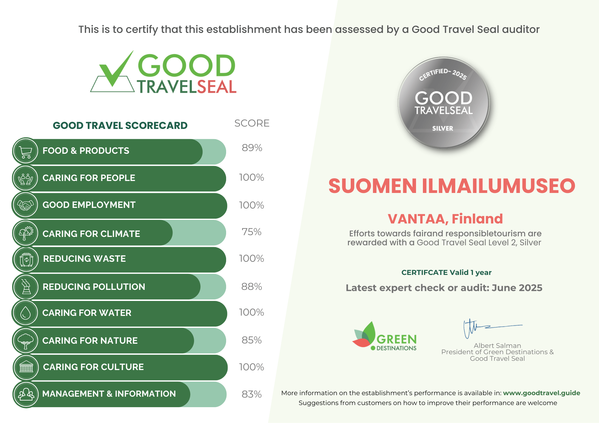 Kesäkuussa 2025 Suomen Ilmailumuseolle myönnettiin kestävän kehityksen Good Travel Seal -sertifikaatti. Teemme jatkuvaa työtä kestävän matkailun edistämiseksi sekä museon nykyisissä tiloissa että Uutta Ilmailumuseota suunniteltaessa.