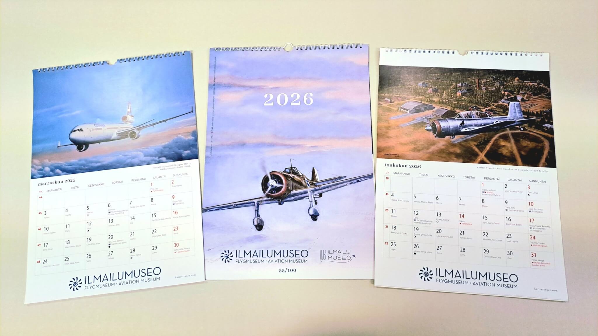 Ilmailumuseon seinäkalenterin kuvituksena on ilmailutaiteilija Kari Vertasen maalauksia niin siivili- kuin sotilaslentokoneistakin. Kalenteri alkaa jo marraskuusta 2025, eli sen voi ottaa käyttöön heti ja upeita kuviakin on tavallisen 12 sijaan kokonaiset 14.